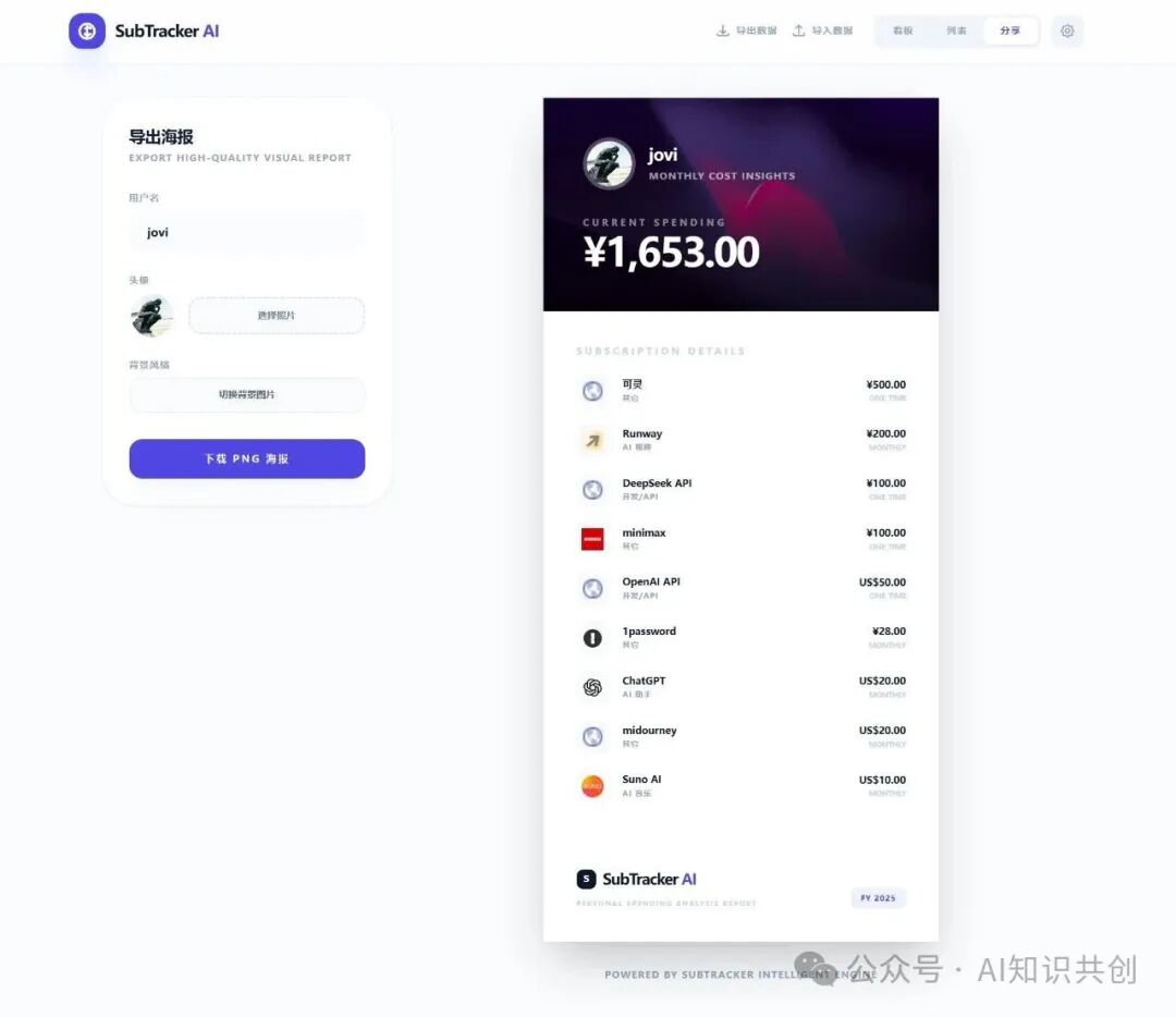 社交属性:订阅海报 现在大家都在晒 AI 武器库,我加了一个 Tab,能一键把你正在用的订阅方案生成一张精美小海报,方便分享给朋友。