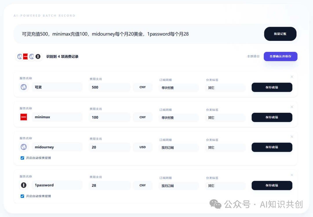 模糊语音输入(最爱): 我习惯口述。你直接对它说:“可灵充值 500,MiniMax 充值 100,MJ 每月 20 美金,1Password 每年 28”,它会自动拆解、识别货币、对齐周期。