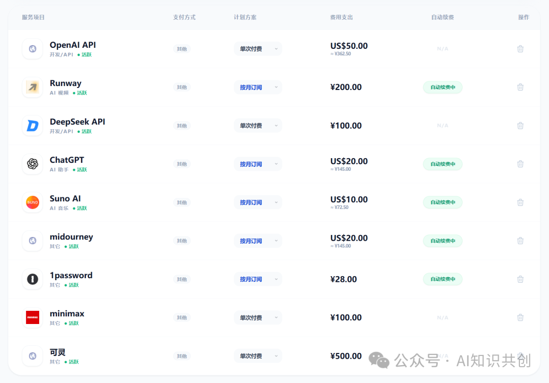 只是直观感受消费还不够,我们需要通过一个列表更直观地看到所有付费工具,它们是订阅、买断还是一次性支付的,这可以帮助我们判断什么时候可以停止续费,什么时候可以调整,以及整体的订阅方案是什么样的。除了看板,我还做了一个列表页,能让你快速预览你订阅过的工具