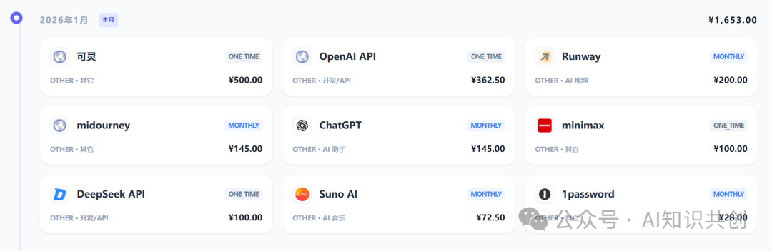别再让那些甚至不怎么用的模型默默吃掉你的 Runway。你可以试试我撸的这个记账工具,把那些零散的 API 消耗、月付订阅、年付工具统统列出来。看看哪些是真正的生产力加持,哪些只是你在焦虑中随手供奉的“香火钱”。