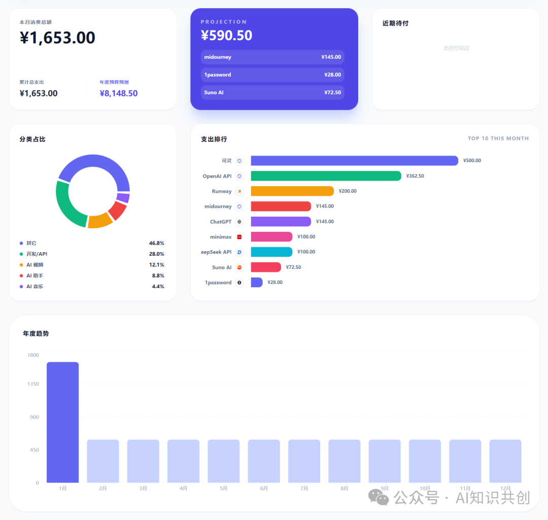 财务可视化看板: 它能直接告诉我:本月总计支出、年度累计预算、工具消耗排行。